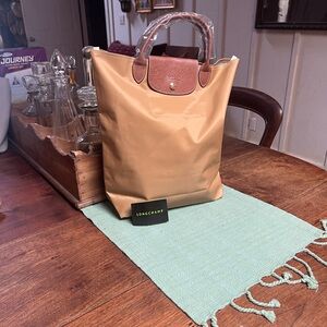 Elegant travel bag with black body and tan leather accents. Ideal for stylish journeys.