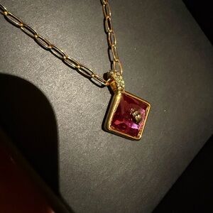 This stunning necklace features a gold chain with a striking pink crystal pendant, perfect for adding a touch of elegance to any outfit.