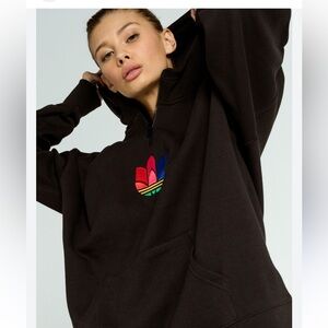 EUC Adidas Women's Black Modern Trefoil Sweatshirt size XL, half zip hooded. Beautiful condition. Love the colorful flowerlike Adidas icon. Warm. Size take missing. Measures 28” PTP. Roomy
