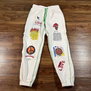 Forever 21 x Ron Bass Embroidered Sweatpant Black Is Power Colorful Women S FLAW Pre-owned in very good condition. Minor flaw on the leg of the sweatpants, barely noticeable. Measurements in photos. Item has been washed. Please see photos. Fast shipping! Message me with any questions.