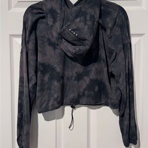 Stylish tie-dye cropped hoodie. Features a drawstring hem for adjustable fit. Soft interior. Perfect for casual wear.