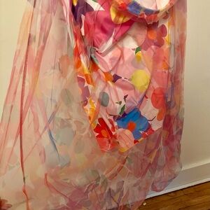 Beautiful strapless floral mini dress with sheer full length overlay attached at the top of the dress. Perfect for a date, as a wedding guest, or party, dance, vacation or just a fun warm day! Dress is stretchy and can be worn as a dress or ruched and worn as a tunic top.