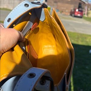 Beautiful cornflower blue glovetanned leather with a contrasting colored leather interior. Excellent barely used condition. Comes from a smoke free/pet friendly home. Please zoom in on all photos as they are part of the description.
