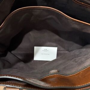 Sophisticated Coach briefcase in rich tan leather. Features sturdy handles and detachable shoulder strap. Ideal for business or travel.