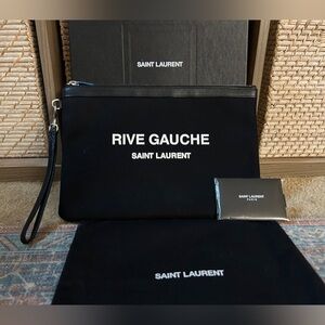 Brand new! Saint Laurent Rive Gauche wristlet bag. Comes with dust bag, box, original authenticity card (sealed, unopened) as well as a secondary COA. Gift ready. 🖤