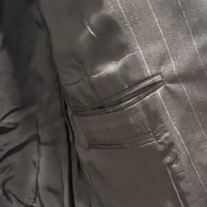 Sophisticated charcoal pinstripe blazer. Ideal for business or formal events. Tailored fit with classic design.