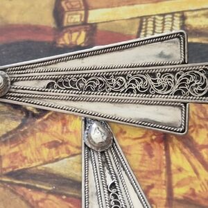 These 925 sterling silver earrings feature a striking, elongated triangle shape that dangles elegantly. The design is further enhanced with intricate filigree inlay, showcasing delicate patterns and swirls within the silver framework. The filigree adds a touch of vintage charm and artisanal detail, making these earrings a statement piece that effortlessly blends modern geometric design with classic craftsmanship. Lightweight and comfortable to wear, they are perfect for adding a sophisticated and eye-catching accent to any outfit, from casual to formal.