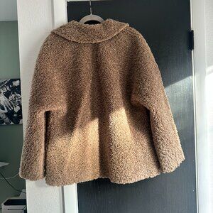 Stay warm and stylish with this cozy tan teddy jacket. Perfect for layering, this jacket adds a touch of elegance to any outfit.