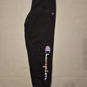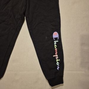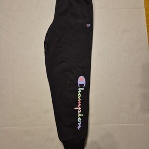 Champion girls jogger sweatpants in classic black with a colorful rainbow script logo down the leg. These youth joggers feature a soft fleece interior, elastic waistband, and ribbed ankle cuffs for a comfortable and secure fit.