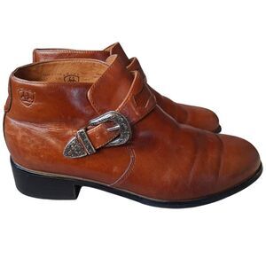 These Ariat ankle boots combine rugged Western charm with a sleek, polished look. Crafted from rich brown leather with a detailed silver buckle and low cowboy heel, they’re versatile enough for riding, casual wear, or nights out.