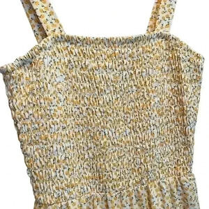 Sienna Sky Smock too dress. Shoulder straps. Ruffle bottom. Skirt fully lined. Tier ruffle. Top is stretchy to fit snuggly. Size: small. Color: printed small yellow gold flowers on ivory background. 100% polyester, Lining: 95% polyester and 5% spandex. Measurements laying flat: 14.5”. Shoulder to waist 16”. Waist to hem 17.25”. No rips, tears or stains. Pet free smoke free environment.