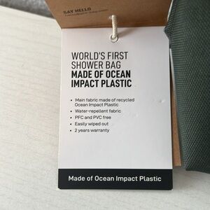 Organize your essentials with this unisex toiletry bag in a sleek light green. Perfect for travel or daily use. Made from recycled ocean plastic water repellent. Measurements 10 inches long, 7 inches high, 4 inches wide, measurements approximate.