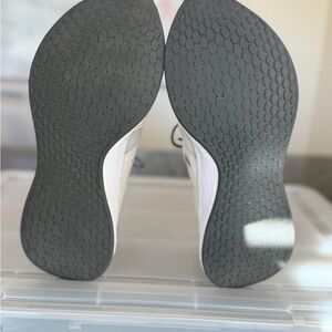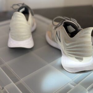 Stylish New Balance athletic shoes. Cream upper with gray accents. Comfortable and durable design.