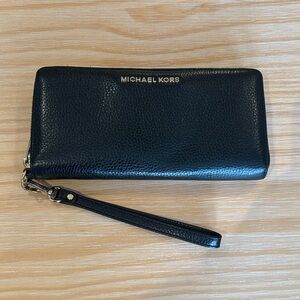 Elegant black pebbled leather wristlet by Michael Kors. Includes a detachable wrist strap.