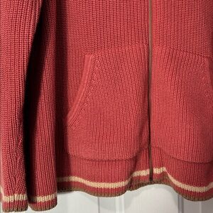 Coral all cotton hooded vintage w zip front, front pockets and tan & beige stripes at hem & wrists. New condition