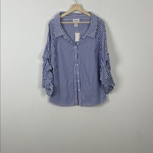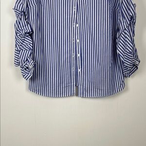 Style Profile: Chic button-down with blue and white stripes. Features a classic collar and ruched sleeves.