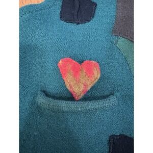 vintage catherine coloney, catherine coloney vest, vintage artwear, artwear sweater vest, patchwork vest, wool sweater vest, felted wool vest, lagenlook, wearable art, boho artwear, artisan vest, mixed media knit, patchwork applique, asymmetrical hem, zip front vest, pocket detail, heart detail, vintage 90s, 1990s artwear, boutique knitwear, statement vest, cozy layering, fall winter vest