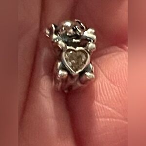 Adorable Pandora 925 Sterling Silver Dog with a Bone Charm featuring a pink heart. Perfect for dog lovers and bracelets or necklaces.