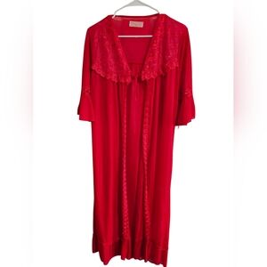 Striking vintage Wanlida sheer robe in a deep romantic red, finished with ornate lace trim at the collar, front placket, and bell sleeves. Lightweight and fluid with a dramatic drape — classic boudoir glamour with a soft, feminine silhouette.