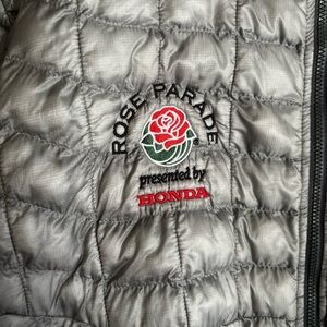 This sleek silver puffer jacket by The North Face features custom an embroidery for the Rose Parade (an iconic annual New Year’s Day event in Pasadena, California) powered by Honda.