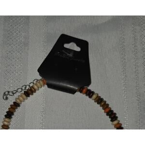 This necklace still has its store tags on it. Tiny little beads that appear to be made out of wood, but could be plastic. Multi Strand, with Autumn colors of Orange, Browns and Cream. Lobster claw clasp. Closed it measures 12" in length(24" total).