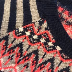 Very holiday ‘ski lodge’ ish. Good quality sweater, not super stretchy or too thin. Minimal pilling which blends in well with the pattern.
