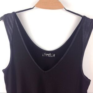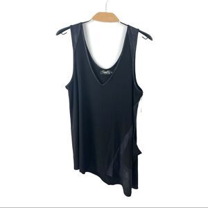 New With Tags Sympli Storm Angle Smock US 10 Black with Pewter Foil Trim Flowy Stretch Wrinkle Free Fabric Sleeveless Tunic V Neck Asymmetric Hem Side Pocket