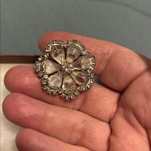 Very pretty vintage set. Stones in bracelet are teardrop shaped, surrounded by rhinestones. They are brown/tan in color. There is one rhinestone missing as seen in the pictures. The bracelet has a safety chain. The earrings are clip on, 1.5” wide. The bracelet is 7”. No makers mark that I could see, but very well made.