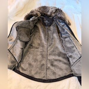 Stay cozy and chic with this women's teddy jacket. The dark gray color and plush faux fur trim offer both warmth and style for chilly days.