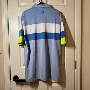 Stylish polo with blue, white, and green stripes. Ideal for casual outings.