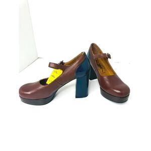 Fly London ERIL Platform Pumps Cognac & Navy Leather Retro 70s Chunky Heel Women’s. Indie Euro Cool 70s Retro Colorblock