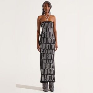 The laws of time do not apply to hot girls, sorry ‘bout it. Arrive fashionably late in The AKIRA Label I’m Late Rhinestone Graphic Midi Dress. This sassy strapless dress is crafted from a super stretchy, semi-sheer mesh fabrication and features a curve-hugging, midi-length silhouette and a bold “Sorry I’m Late, I Really Didn’t Want to Come” graphic adorned with silver rhinestones.