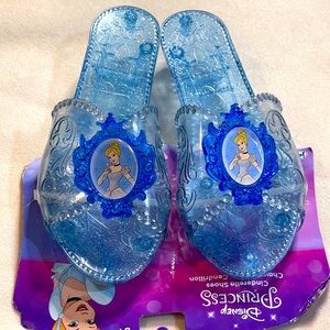 Brand new with tags Disney Cinderella play shoes. The shoes were never taken off the cardboard backer, but the cardboard is a little bent (see pictures). The shoes feature exquisite detail, and would make a wonderful addition to any child’s play wardrobe
