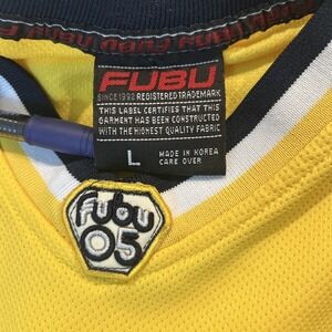 This Vintage FUBU Sports Athletics 1992 05 2005 Baseball Jersey is a vibrant yellow polyester shirt with a solid pattern and short sleeves, perfect for activewear. The jersey features a double-sided design and is sized L, making it suitable for men who enjoy streetwear fashion. With its athletic fit and baseball theme, this shirt is a stylish and nostalgic addition to any wardrobe, representing a piece of sporty history from the 2000s. Made in Korea, Republic of, this jersey is a great choice for those looking for a unique and retro sports-inspired top.
