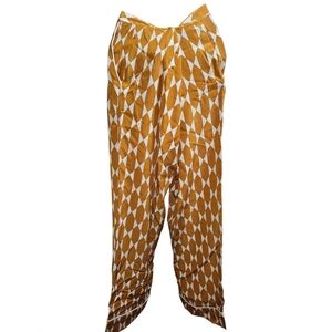 New with tags Tory Burch Devi Pants Size 6 Medium Devi 100% silk unlined lightweight pants in Masala, a rust gold diamond tile print. Gold zipper fly with hook closure, front slat pockets with white piping, crop wide hem legs. Laid flat measurements Size 6: waist 15", rise 11.5", inseam 27"