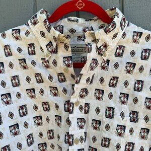 Slightly off white cotton shirt with navy, dark red, golden yellow squares and diamonds