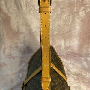 Vachetta has an even honey patina with some marks and watermarks. Canvas is thick, sturdy, bright, and vibrant with no cracks and some rubs. Hardware has some tarnish from age. Interior compartments are clean. No foul odors, but may have a light vintage/storage scent for sensitive noses. Bag with adjustable strap only - no inclusions.