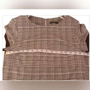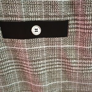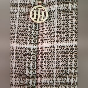 Tommy Hilfiger women's dress, size 6, in excellent used condition (EUC). Features a classic plaid pattern with black trim on the sleeves and hem. Short sleeves, structured fit, and decorative front pockets with button details add a stylish touch. Perfect for work or casual wear.