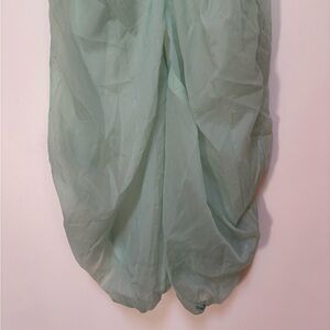 Features: Durable, water-resistant nylon fabrication; elasticated waistband and bottom cuff; fabric drapes around lower leg