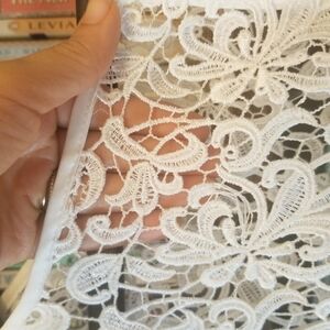 Cap sleeves, lace overlay on satin liner, keyhole back. Slip has spaghetti straps and built in bra cups-can be worn without bra. Slip and liner hides under garments/imperfections. Perfect for bridal shower, city hall wedding, bachelorette or as spring