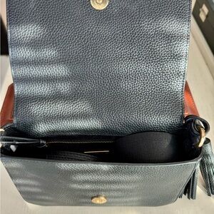 Chic black leather crossbody. Includes tassel and 2 adjustable straps. It has an open pocket on the back to store your phone. Iconic Tory Burch emblem. It’s 8”x 6.5”