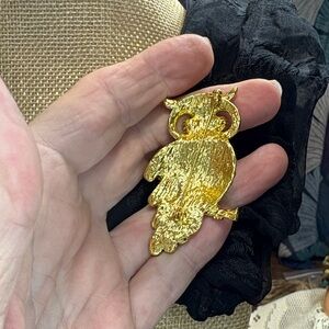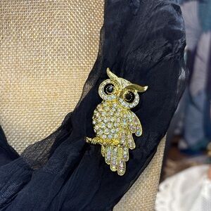 This exquisite gold owl brooch is embellished with shimmering crystals, adding a touch of elegance to any ensemble. A perfect accessory for those who appreciate unique and stylish jewelry. New without tags. #151