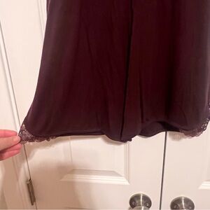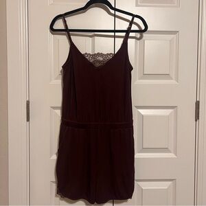 Elegant burgundy romper with lace trim. Adjustable straps. Soft and comfortable fabric.
