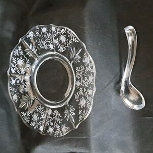 Beautiful near perfect etched glass bowl with matching saucer and spoon. Intricate floral design. Perfect for serving or display.