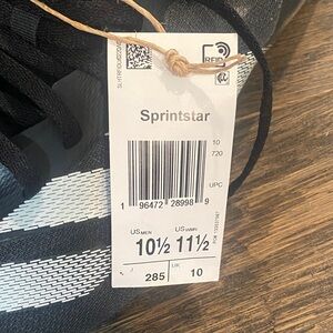 Stylish athletic shoes with iconic stripes. Perfect for running. Lightweight and supportive. Spikes not included. No flaws. Smoke free home.