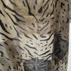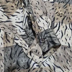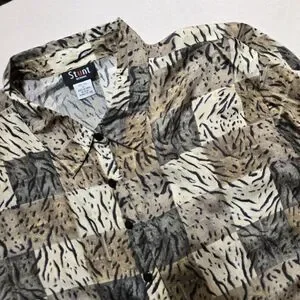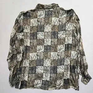 Vintage Stunt Woman button-up blouse in size 3XL. Made from 100% silk, this lightweight, flowy top features a bold animal print patchwork pattern in neutral tones. The shirt has a collared neckline, long sleeves with button cuffs, and a soft, luxurious drapeperfect for elevated casual or office wear.