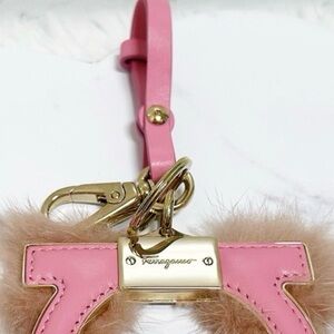 Authentic Salvatore Ferragamo RARE / HTF Antique Rose & Pink Fur Logo Bag Charm / Keychain. Made in Italy- this Salvatore Ferragamo Gancini fur bag charm is crafted in a light brown/pink “Antique Rose” Visone Fur on one side and barbie / “Carnation Pink” Calfskin leather on the other side with shiny gold-tone hardware. In a Ferragamo logo shape- engraved Ferragamo throughout the hardware. Has an attached hook for bag wear and round key ring for keys so it has many uses / ways to wear- could also attach to a jean belt loop. In like new / excellent condition. Includes its original box and care card only. *Other pictured items are not included. Message for further details, photos or offers.