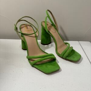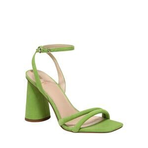 Sam Edelman Kia ankle-strap heels in bold Apple Green suede. Features a modern square/open toe and an angled 3.5” block heel that’s easy to wear with dresses or denim. Statement color with clean, minimalist lines.