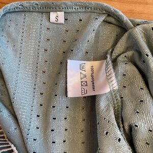 Description: stretchy green short sleeve top open net with beige islet lace detail in US women’s size S.