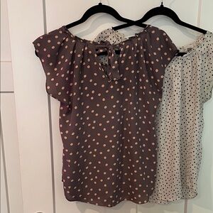 Set of 2 pleated polka dot blouses with tie backs at the neck. Stylish tops with charming polka dots. Ideal for versatile wear.
